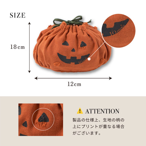 ・ハロウィーンのかぼちゃ「ジャック・オー・ランタン」のお顔に10moisのロゴ入りのオリジナル巾着です。